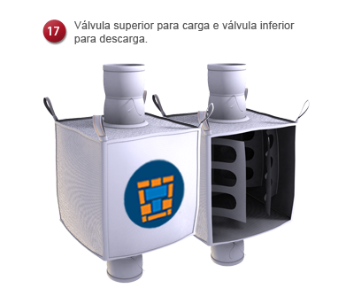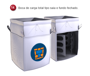 Containers flexíveis confeccionados em tecido de polipropileno, com sistema de fixação das alças em toda a altura do Mag Bag, proporcionando o formato caixote.